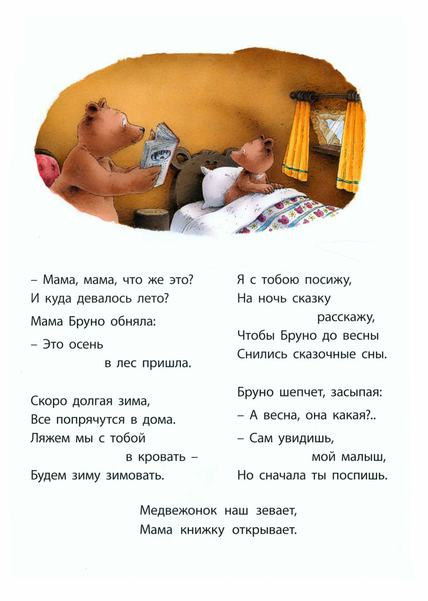 Медвежонок Бруно отправляется спать. А чтобы он не грустил долгой зимней ночью, мама почитает ему книжку перед сном. Книжка непростая - в ней собраны забавные и нежные истории о самых разных зверюшках. Тут и слоненок, и бегемотик, и крокодильчик, и черепаха… А когда Бруно проснется весной, после зимней спячки, он расскажет мамины сказки своим лесным друзьям. Веселые стихи Серены Романелли и чудесные рисунки знаменитого Ханса де Беера порадуют маленьких читателей.