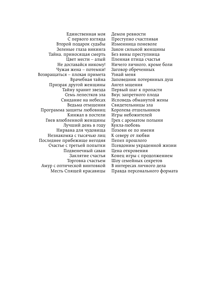 Детектив больше для женской аудитории. Сюжет динамичный, сеттинг на высоте. А вот персонажи не понравились (ну, пожалуй, кроме следователя Натальи). Ни Кагоров, долгое время терпевший мерзкое существо рядом, ни Сергей, слишком полагавшийся на мнение родителей, ни его жена, ни неглупая Муся с ее бесцельной жизнью ради квартиры и денег, ни циничная и туповатая молодежь, вся жизнь которых - найти папика или дозу наркотика. Впрочем, мне редко нравятся бездуховные персонажи произведений Романовой (хотя замечу, что психология героев автором проработана очень хорошо). Но это никак не сказывается на общем впечатлении от произведения. Читается легко, с интересом. Окончание книги напоминает незабвенную Агату Кристи, когда все собираются в большой комнате, чтобы окончательно выявить виновного, ведь преступники оказались хитрыми, а прямых доказательств у следователей явно не хватало.