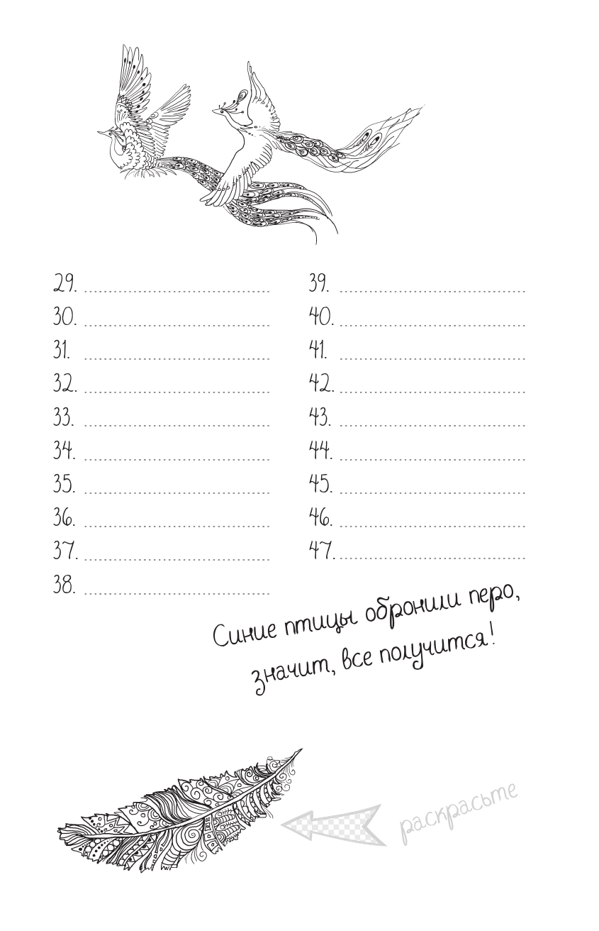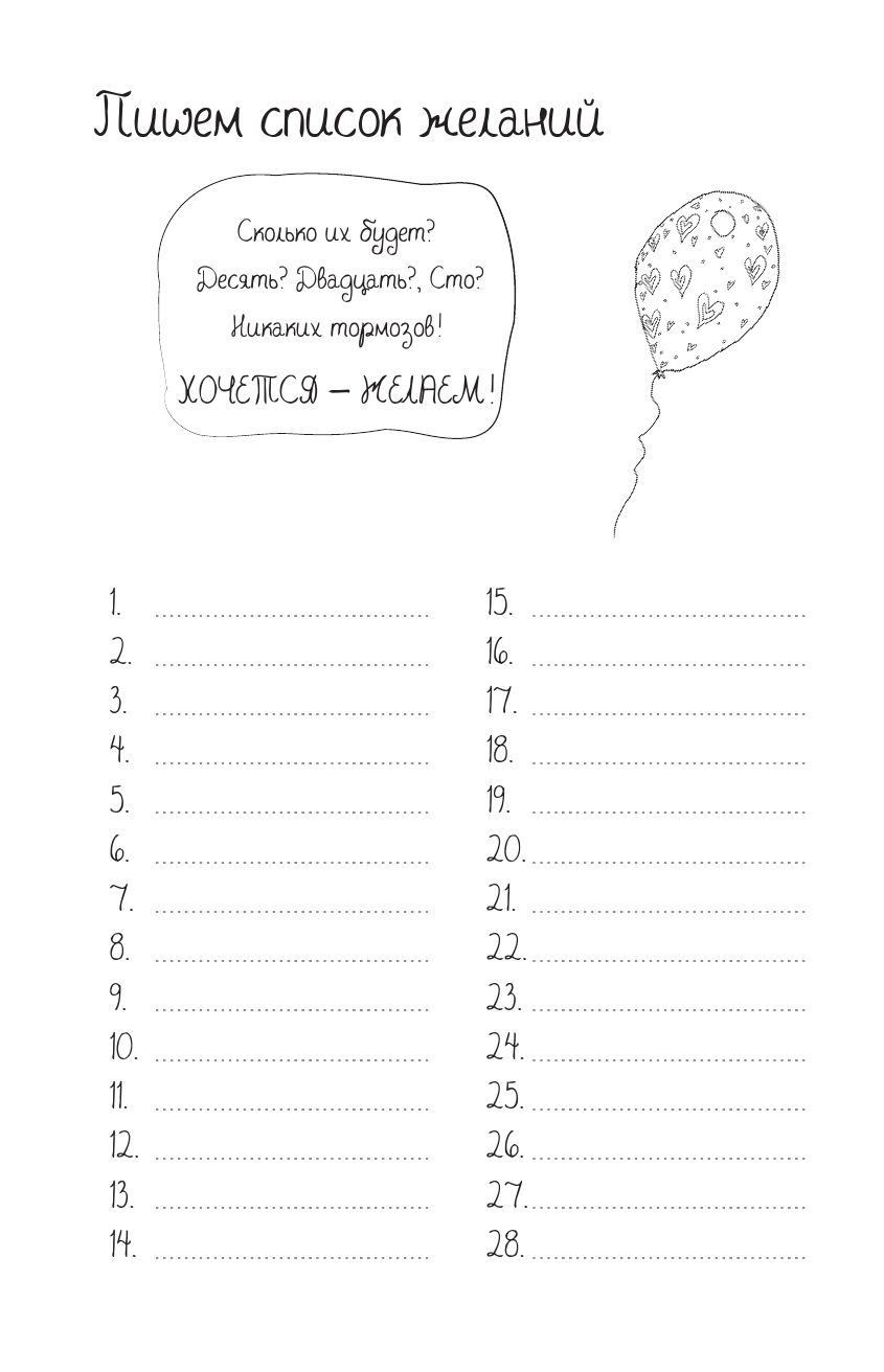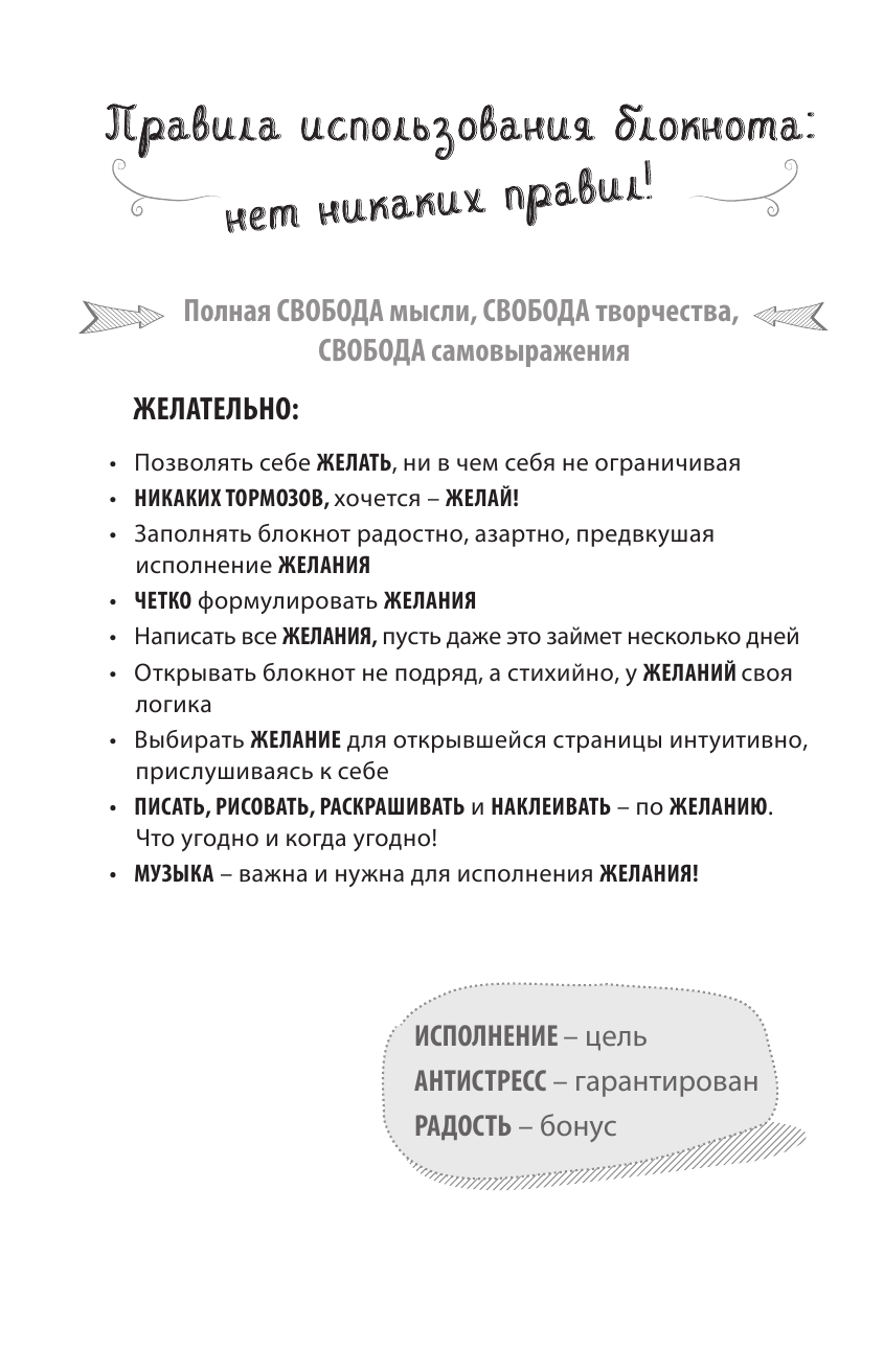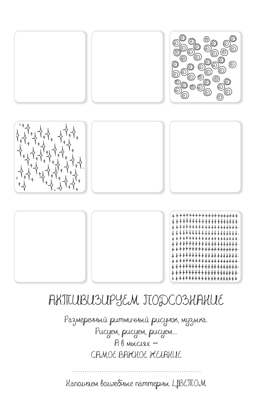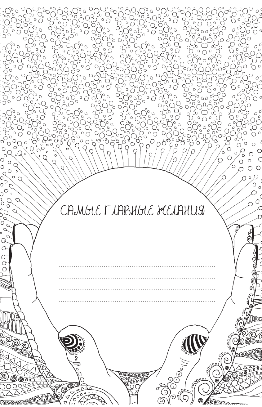 Изящные и стильные авторские рисунки, необычные и вдохновляющие творческие задания на каждый день дают возможность творить, рисовать, раскрашивать и одновременно работать со своими мечтами и желаниями, визуализировать их, обдумывать, а значит, реализовывать самые смелые ожидания! Работа с блокнотом вдохновляет, расширяет границы сознания, повышает настроение, делает радостнее и раскованнее. А самое главное — снимает стресс и беспокойство.
