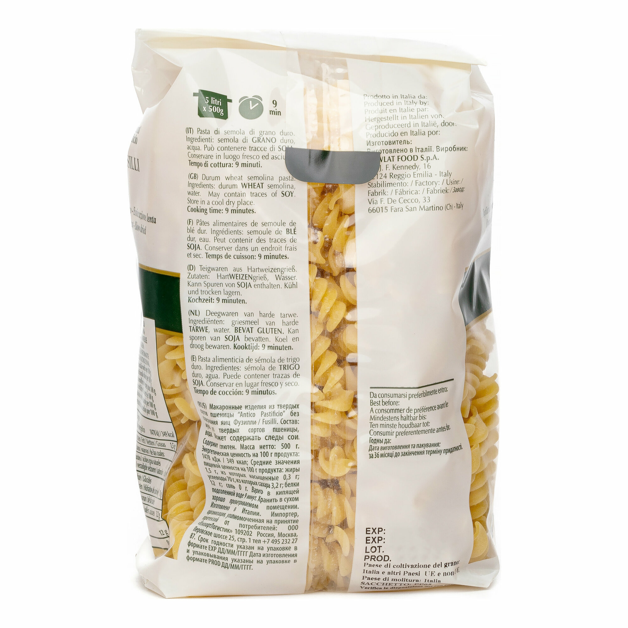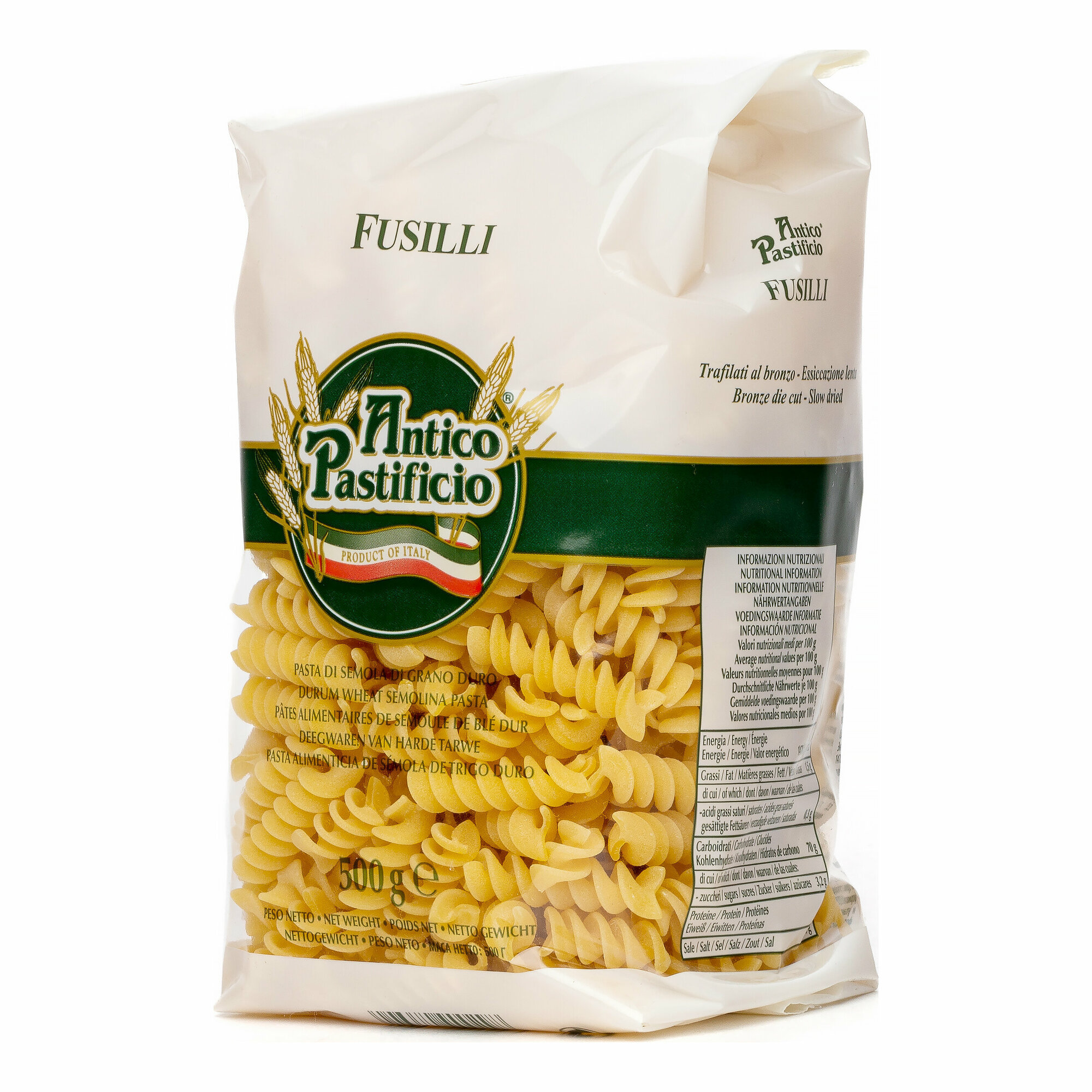 Макароны "Фузилли" от Antico Pastificio - изделия из твердых сортов пшеницы в виде спиралей. Без яиц в составе. Из-за своей формы макароны, как штопор, "входят" в соус, максимально удерживая его на поверхности. Фузилли хорошо сочетаются как с густыми и сложными, так и с легкими составами. Однако лучше всего макароны гармонируют с мясными и томатными соусами, сыром рикотта и свежими салатами. Изготовлено в Италии.
