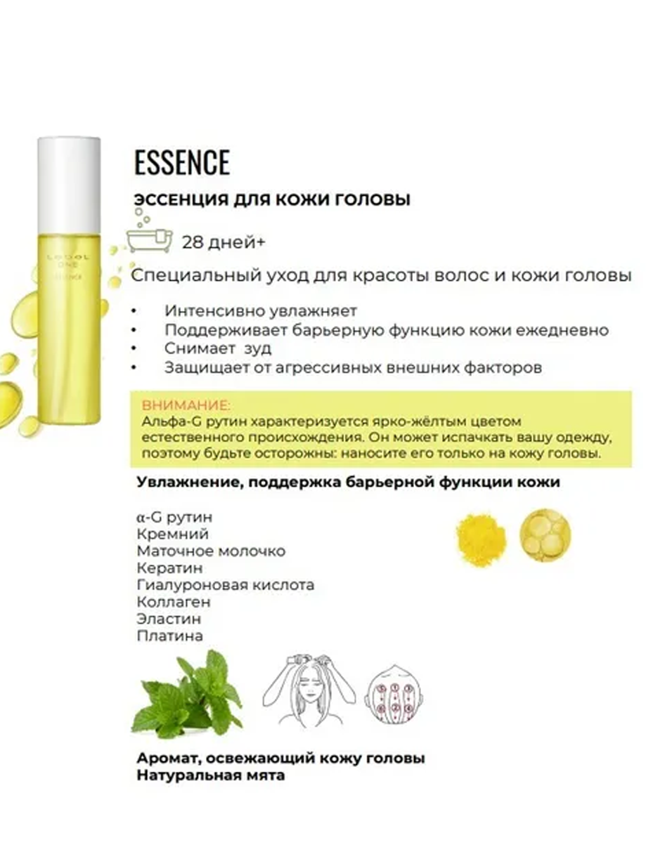 - комплекс Альфа-G-рутин - стимулирует обновление клеток кожи, защищает стволовые клетки кожи головы, способствует выработке коллагена, улучшает способность кожи самостоятельно производить влагу
