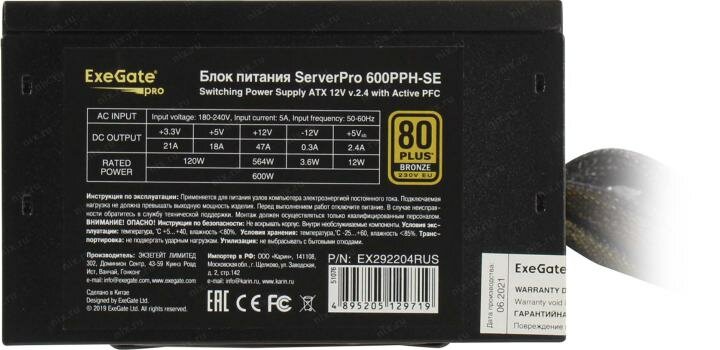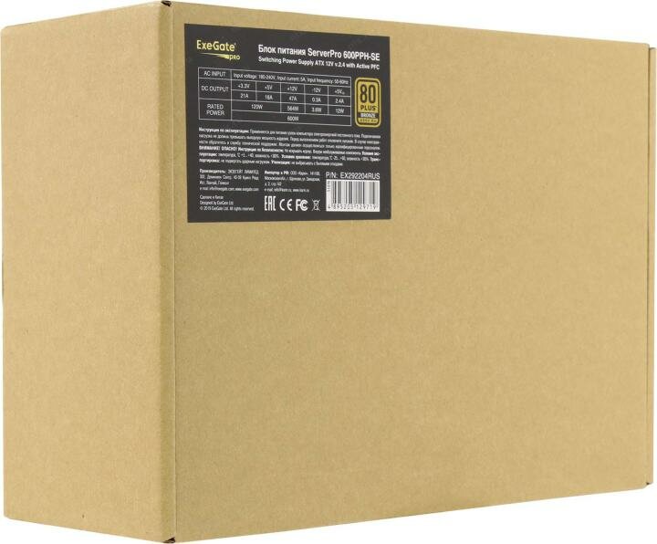 Блок питания ATX Exegate 600PPH-SE 600W for 3U+ cases APFC 80 PLUS Bronze 120mm fan EX292204RUS