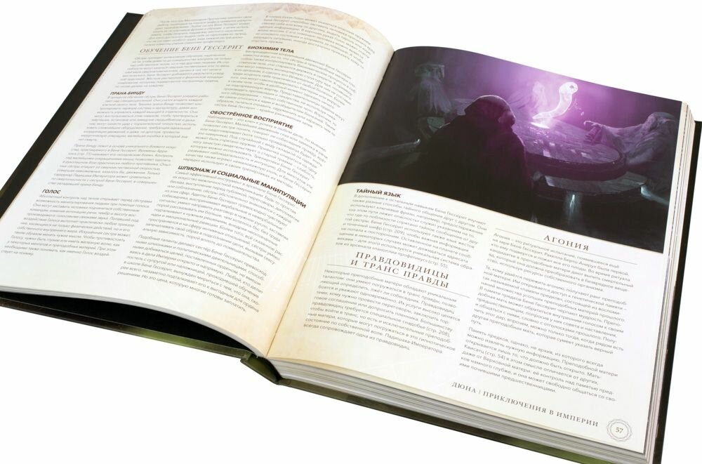 Жизнь за пряностьВся эта игра зависит от вашей фантазии. Да, у нее есть правила, которые помогают понять лор и решить исход схватки, например. Сюжет двигаете вы - создаете своего персонажа, ставите перед собой цели, плетете замысловатые интриги. Вы можете быть фрименом, ментатом или даже сестрой Бене Гессерит - здесь все возможно. Четкого сценария победы нет - важно вжиться в свою роль и получить удовольствие от процесса. Внимание! Это настольная ролевая игра. Книга дает вам необходимые для игрового процесса знания и детали. Кубики и другие аксессуары не входят в комплект.