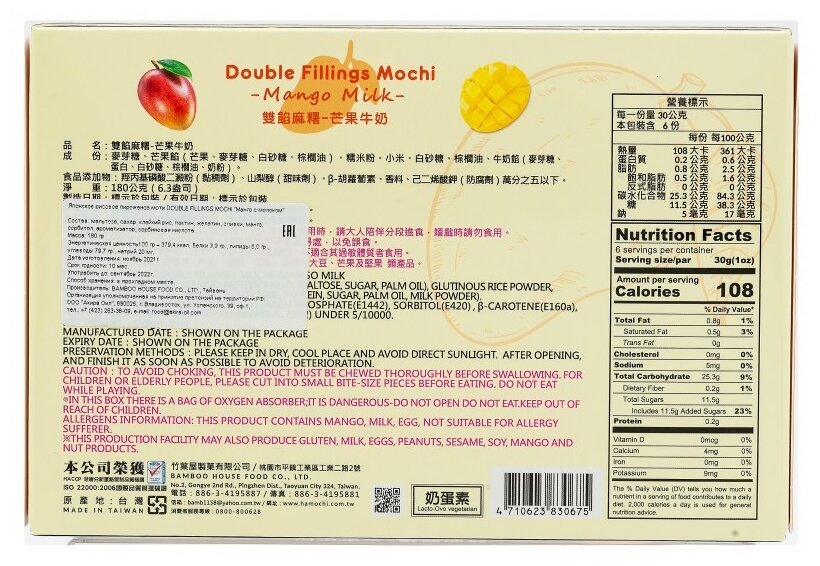 | Состав | мальтоза, сахар, клейкий рис, пектин, желатин, сливки, манго, сорбитол, ароматизатор, сорбиновая кислота |