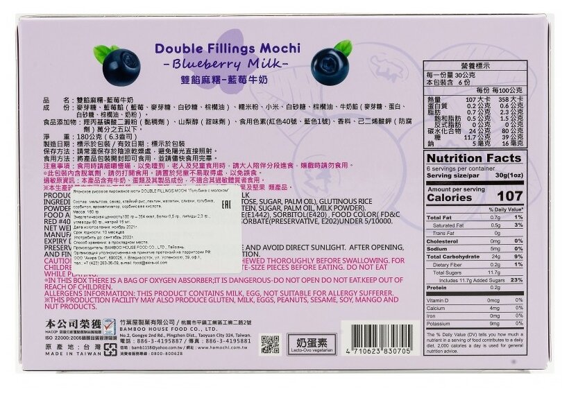 | Состав | мальтоза, паста из голубики (голубика, мальтоза, сахар), клейкая рисовая мука) молочная паста(сухое молоко, сахар, масло, яичный порошок). |