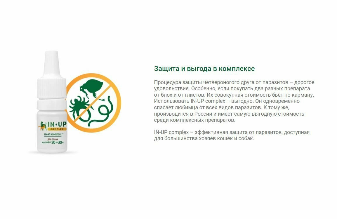 Капли ИН-АП комплекс для собак от 30 до 50 кг – лечебно-профилактическое антипаразитарное средство, обладающее комплексным действием против личиночных и половозрелых фаз развития эктопаразитов (блох, иксодовых клещей, вшей, власоедов) и эндопаразитов (круглых и ленточных глистов), паразитирующих у собак. ИН-АП комплекс выпускается в форме раствора для наружного применения. Рекомендуется регулярно проводить дегельминтизацию собаки.