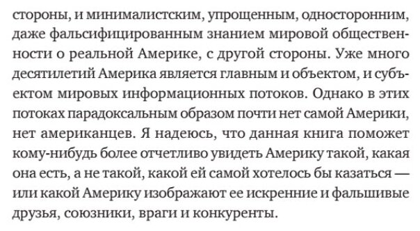 Очень интересно узнать про Америку именно от русского человека. Автор прожил там много лет и объездил всю страну. Информация об этой нации, которая неосознанно поступает к нам еще и через призму враждебной политики печально скудна. Что знают дети про Америку? Бургеры, ожирение и супергерои. Взрослого человека же зачастую больше интересны политические моменты с этой страной, и я не встречала людей в возрасте, которые бы особо хорошо отзывались об Америке или хотя бы интересовались нацией. Нельзя сказать, что это неправда или нечестно, история наложила свой отпечаток, однако нынешнее поколение открыто для нового, нет, оно желает нового, новых стран, знаний и людей. Автор рассказывает о людях Америки, об их нормах, ценностях и привычках. Это очень интересно, поскольку хоть мы все и люди, но все нации отличаются друг от друга, порой настолько, что нам сложно понять друг друга, например, юмор, о котором упоминает автор. Автор рассказывает не только о людях Америки, но и их причастности к своей стране, они очень патриотичные, как и россияне. Я могу сказать, что их отношения с государством и правительством тоже иные, нежели у нас, автор рассказывает и об этом. Люди, страна и государство - три части книги. В головах людей нового поколения живет тяга к новым открытиям, все люди, которые встречаются на нашем пути, особенно если они хоть немного другие, оставляют свой вклад в нашем мировоззрении, так мы становимся "больше", более открытыми, за это я люблю приключения. И таким опытом стоит делиться, как это и делает автор.