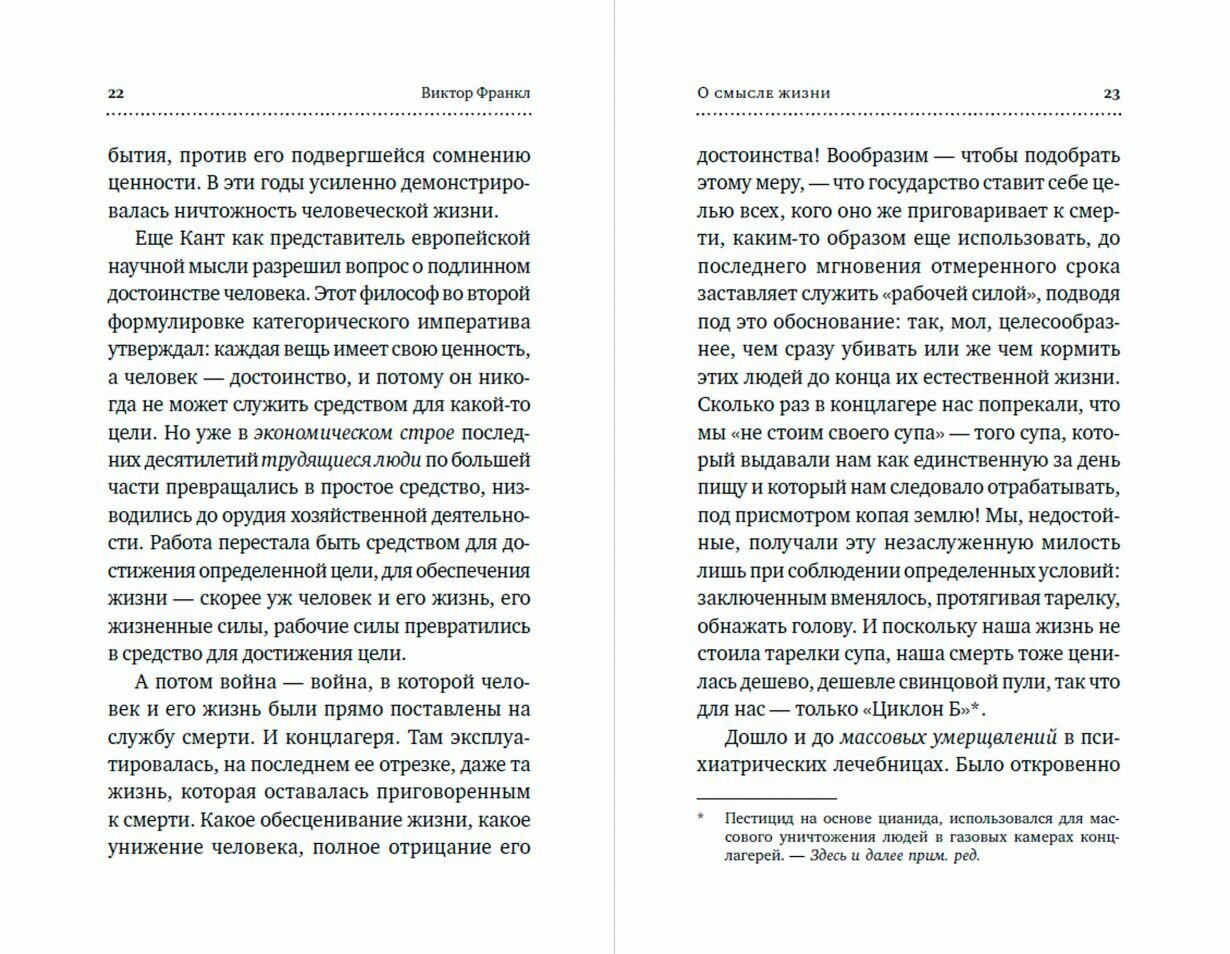 Такая небольшая , но важная книжица, всегда держу у кровати что бы перечать некоторые моменты перед сном. Читается легко и продолжает мысли прошлых книг Франкла. Читаешь и как будто слышишь его голос в голове. Как нистранно именно в минуты глубоко отчаяния данная сокровищница мудрости позволяет вновь обрести смысл. Книга карманного размера так что можно носить с собой