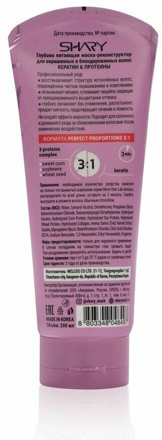 Модель: Маска-реконструктор для волос Shary глубоко питающая кератин и протеины для окрашенных и блондирован