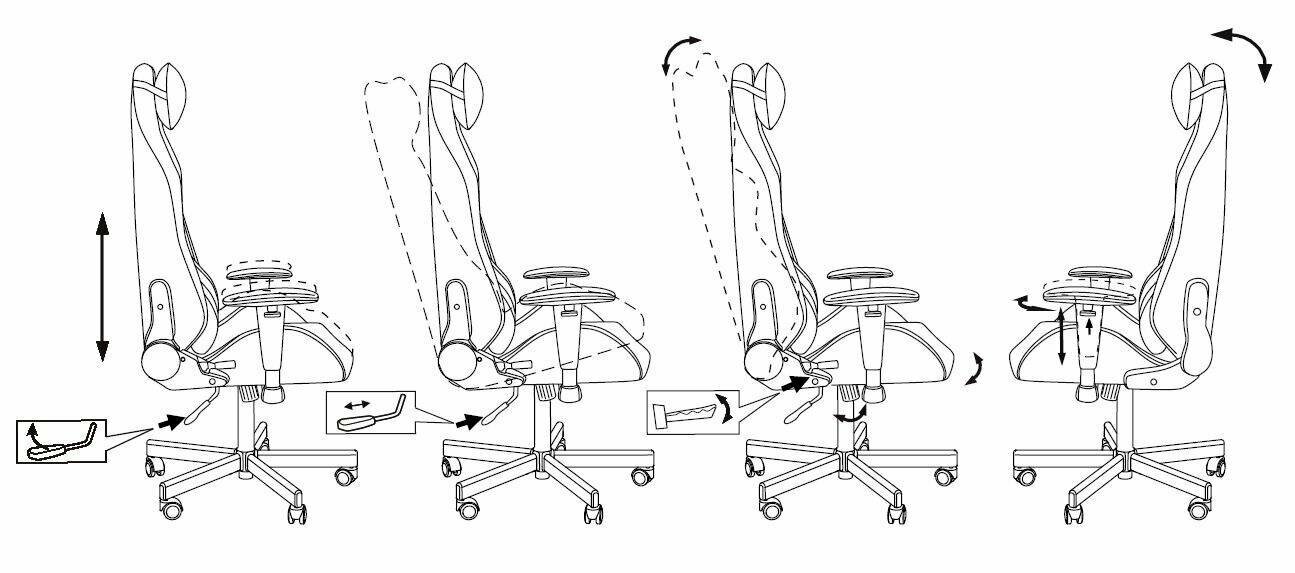 | Регулировка | высота сиденья, наклон спинки (реклайнер 90-150 градусов), высота подлокотников, высота подголовника (подушка), поворот подлокотников, регулировка поясничной поддержки (подушка) |