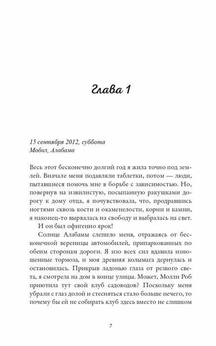 Книга меня заинтриговала своей аннотацией- ни чего не было понятно, казалось это фэнтази, но по отзывам это не так! В общем решила сама познакомится с автором и её произведением! И мне понравилось! Главная героиня расследует странные смерти своих бабушки и мамы. Ее преследует прошлое ее семьи! Действие происходит на юге Америки - история этих южных штатов сыграет важную роль в жизни главной героини! И да ничего фантэзийного в истории нет. Но это не минус.