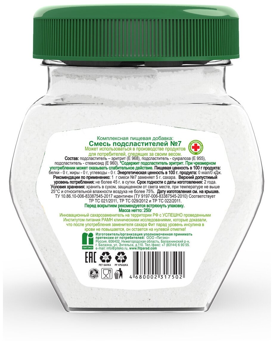 Смесь подсластителей №7 может использоваться в производстве продуктов для целевой группы потребителей, следящих за своим весом. Верхний допустимый уровень потребления: не более 45 г в сутки. 1 г смеси подсластителей №7 заменяет 5 г сахара.