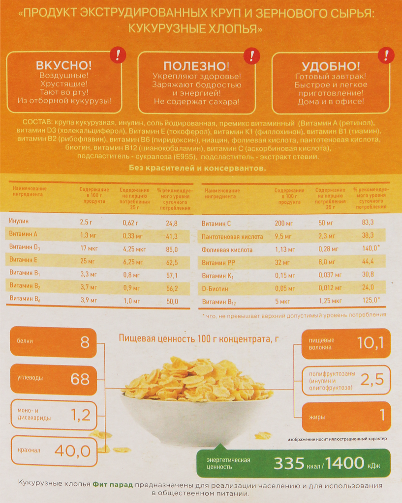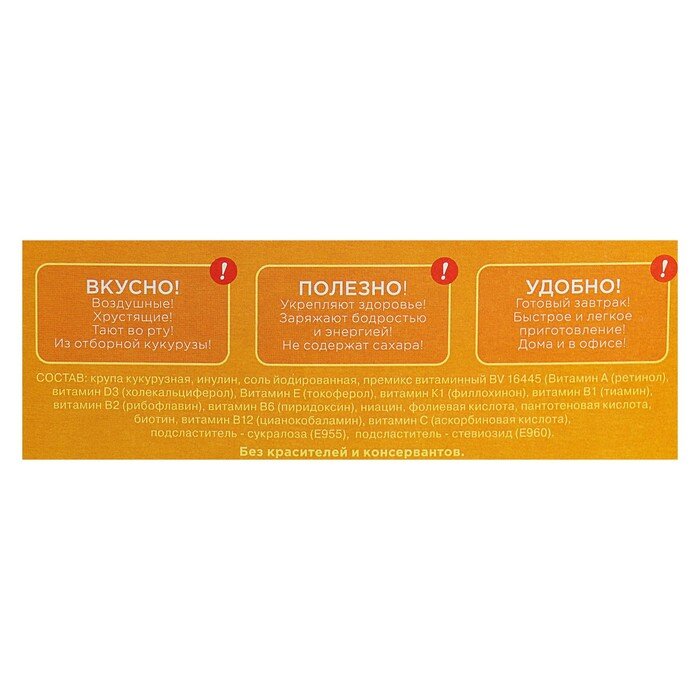 | Состав | крупа кукурузная, инулин, соль йодированная, премикс витаминный, подсластитель - сукралоза (Е955), подсластитель - стевиозид (Е960) |