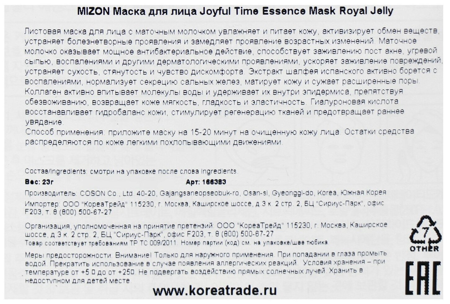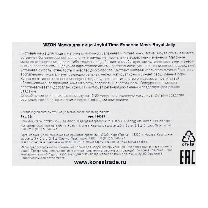 На сегодняшний день товар «Mizon Тканевая маска с экстрактом маточного молочка 23 г (Mizon ) (ЭХ99989428678)» можно купить с кешбеком в 1 магазине: Яндекс.Маркет