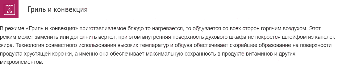 | Режимы нагрева | нижний нагрев, верхний нагрев + нижний нагрев, гриль + конвекция, большой гриль, малый гриль, конвекция |