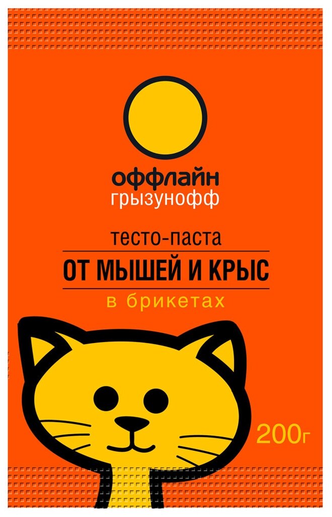 **Тесто-паста Грызунофф оффлайн (200 г)** — эффективное средство, предназначенное для борьбы с разными видами крыс (серых и черных) и мышей (домашние и полевки). Вредителей привлекает запах и вкус теста. Грызуны умирают после поедания приманки.