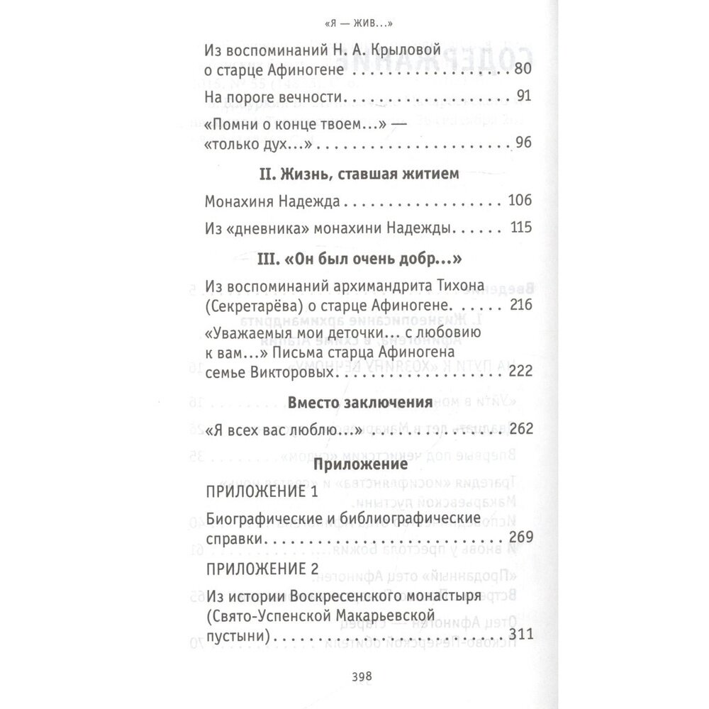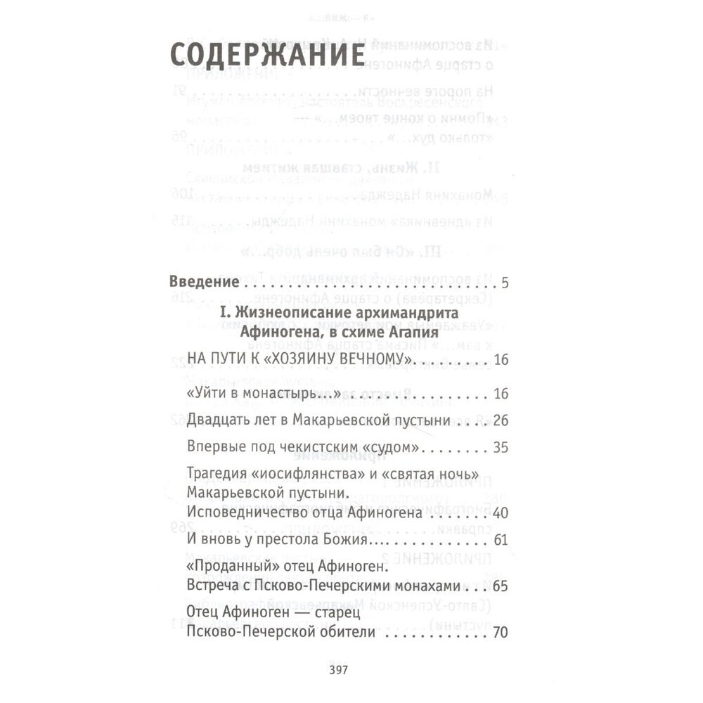 В книге представлены также поучения старца Афиногена, его дневник (келейные записки) и письма, а также весьма ценные воспоминания о нем его келейницы, ухаживавшей за старцем до самой его кончины, - монахини Надежды.