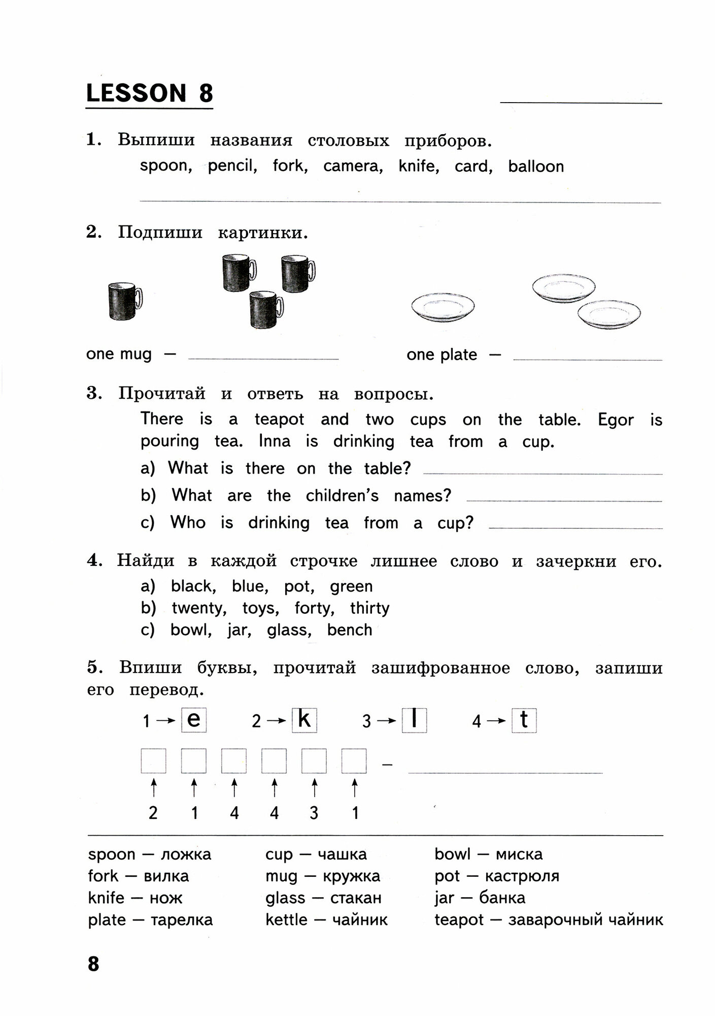 Тетрадь предназначена для повторения и закрепления пройденного материала по английскому языку за курс 3-го класса. Задания предлагаются детям для самостоятельного выполнения и позволят сохранить приобретённые за год умения и навыки. Пособие может быть использовано в течение учебного года для занятий в школе и дома. Ответы помогут взрослым проверить задания.