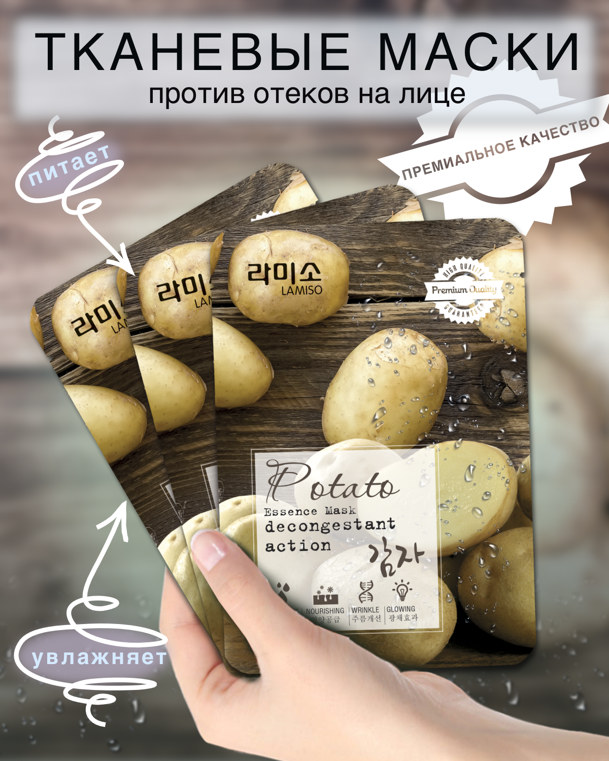 Экстракт картофеля эффективно успокаивает и питает огрубевшую кожу, активно увлажняет, очищает, сохраняет ее упругость и эластичность, защищает от влияния свободных радикалов. Благодаря выраженному противоспалительному свойству экстракта картофеля, маска идеально подходит для ухода за чувствительной и поврежденной кожей.