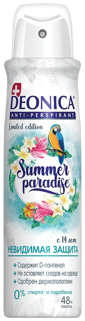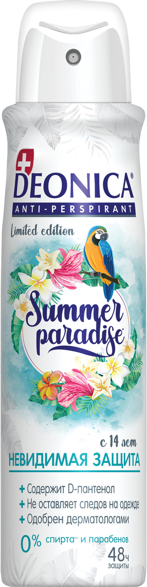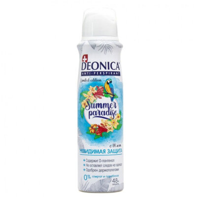 У серии дезодорантов Deonica отличные защитные характеристики. Перепробовала всю линейку и осталась очень довольна. Дезодоранты качественно освежают кожу и предотвращают запах надолго. Есть в линейке ненавязчивые ароматы, не перебивающие запах парфюма, есть яркие ароматы. Summer Paradise это яркий, сладкий аромат. Очень насыщенный, интенсивный запах тропиков и феерический эмоций. Держится долго. Сам флакон удобен в использовании. Распылитель не заедает, струя равномерная. Белье не портит, разводов не оставляет. Недостаток только один:опять куплю.