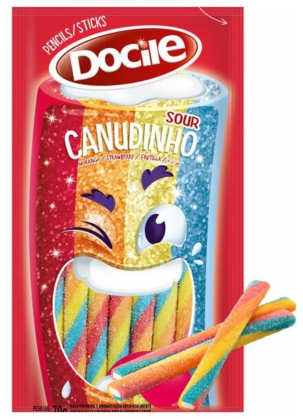Мармелад Docile Sour Цветные карандаши со вкусом клубники 70 г — упругие конфеты-палочки, покрытые сахарными крупинками, которые изготавливаются в Бразилии из высококачественных ингредиентов с добавлением фруктово-ягодных соков и экстрактов.