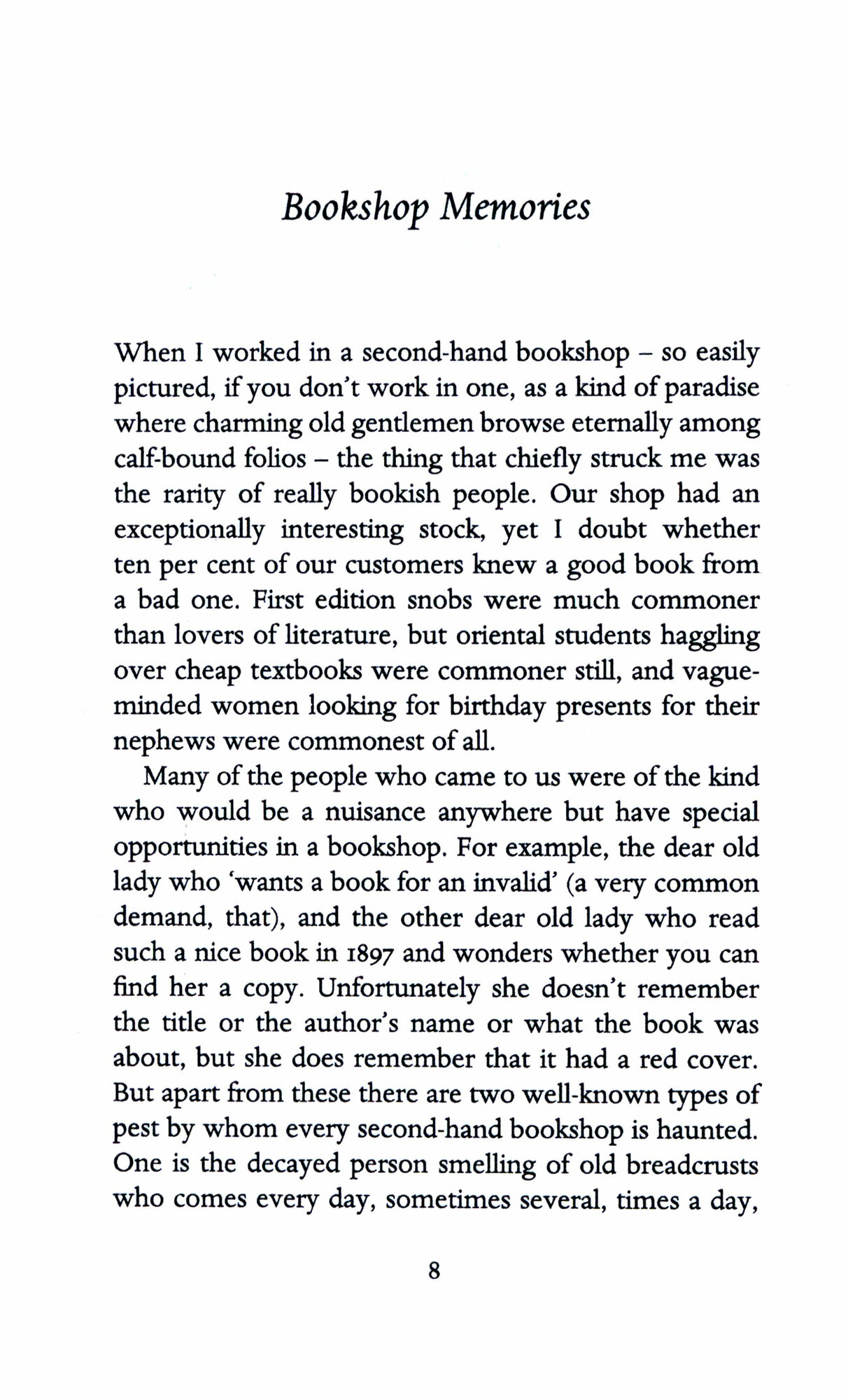Этот тонкий томик содержит шесть эссе, которые могут заставить вас улыбнуться, возможно, огорчить и, безусловно, заставить задуматься. Оруэлл размышляет о том, сколько он тратит на книги, вспоминает о своей работе в книжном магазине и о том, как тяжело болел в парижской больнице, размышляет о достоинствах рецензирования книг, цензуре литературы, патриотизме и своем безрадостном времени, проведенном в качестве стипендиата в подготовительной школе. Большинство из этих статей были опубликованы в конце 1930-х - середине 1940-х годов, но они по-прежнему удивительно актуальны сегодня.