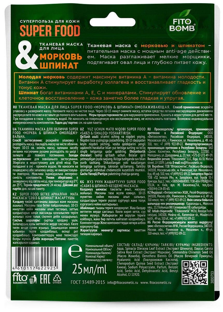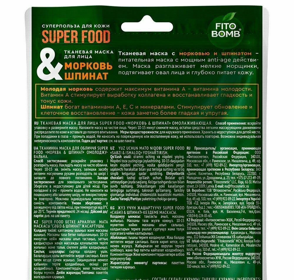 Сервис сравнения цен СкидкаГИД предлагает сравнить цены на товар «Тканевая маска для лица Морковь & шпинат омолаживающая Fito косметик 25 мл»