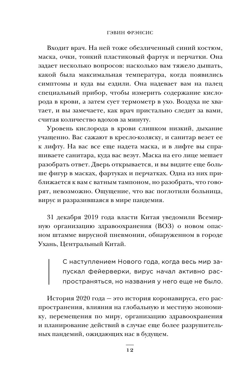 Перед вами книга Гэвина Фрэнсиса, автора бестселлера «Путешествие хирурга по телу человека», который уже в качестве врача общей практики столкнулся с пандемией коронавируса. В ней он рассказывает о самых тяжелых и непредсказуемых месяцах в своей карьере. А также о смелости врачей, которые, рискуя собой, работали в «Красной зоне», чтобы остановить распространение инфекции.