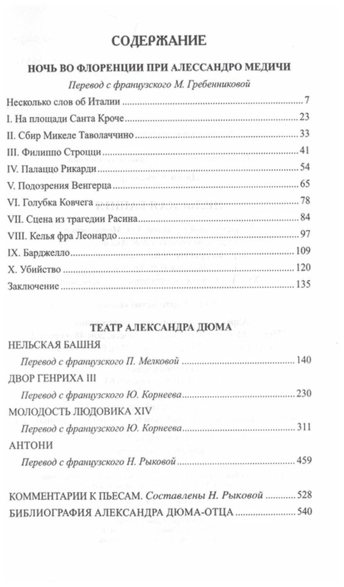 Остросюжетная повесть «Ночь во Флоренции» рассказывает историю нового Гамлета эпохи позднего Ренессанса. Жемчужина плаща и шпаги — пьеса «Нельская башня» — дает альтернативную трактовку страшной средневековой легенды, опережая славу романов Дрюона и Мишеля Зевако на заданную тему. Еще одна жемчужина жанра — пьеса «Двор Генриха III» — вступает в мощное соперничество с историей самой «Графини де Монсоро»! Остроумная комедия «Молодость Людовика XIV» легко и изящно меняет трактовку некоторых событий романов о мушкетерах. И наконец, «Антони» — самая личная и скандальная пьеса Дюма, постановка которой произвела настоящий фурор в театре XIX века. Публика буквально рвала в клочья перчатки от аплодисментов. «Антони» сыграли сто тридцать раз подряд, что по тем временам было почти неслыханно.