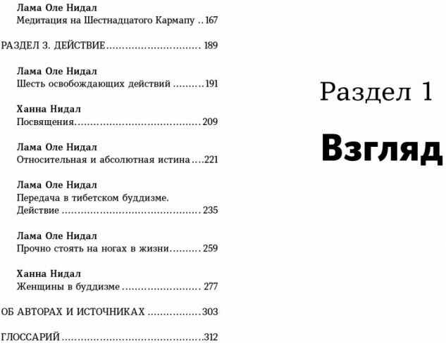 Книга составлена из статей и лекций Ламы Оле Нидала и его жены Ханны, опубликованных за последние 25 лет в различных буддийских изданиях. Статьи организованы в три раздела — в соответствии с «тремя колоннами», на которые традиционно опирается буддийская практика: «Взгляд», «Медитация» и «Действие». Тексты раздела «Взгляд» посвящены философским основам буддизма, второй представляет фундамент буддийской медитации и описывает медитационные техники, в третьем авторы дают советы о том, как можно сохранять и использовать те состояния, которые достигаются посредством медитации.