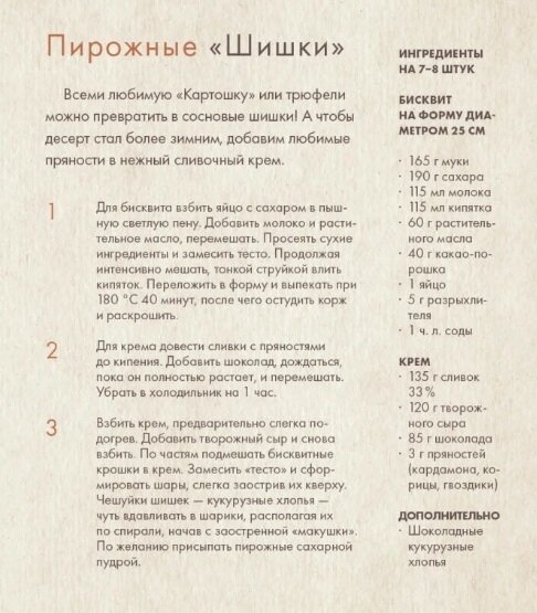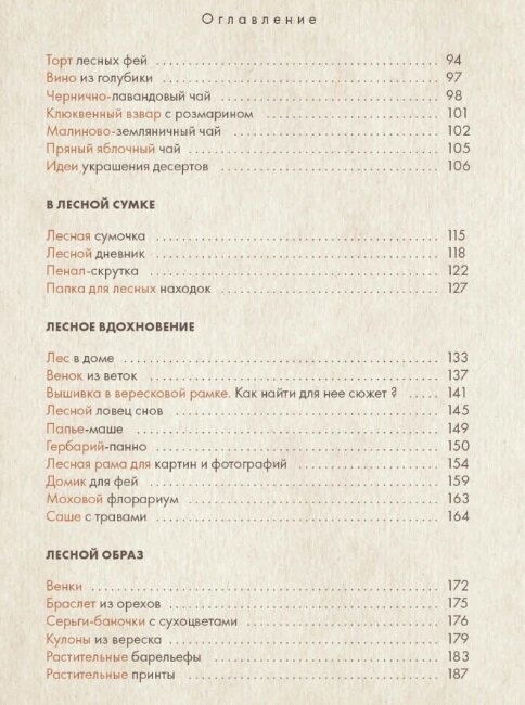 Книга подойдёт тем, кто любит готовить десерты (рецептов в книге довольно много) и делать простые (если не примитивные) поделки с детьми из лесных материалов.