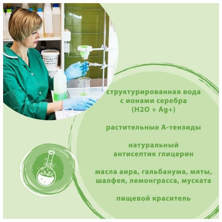 | Состав | подготовленная вода ? 30%; А-тензиды (ПАВ из растительного масла) 5-15%; Н-тензиды (ПАВ из растительного масла) ? 5%; глицерин растительного происхождения ? 5%; гипоаллергенная парфюмерная композиция «Алоэ» на основе эфирных масел аира, гальбанума, мяты, шалфея, лемонграсса, муската. |