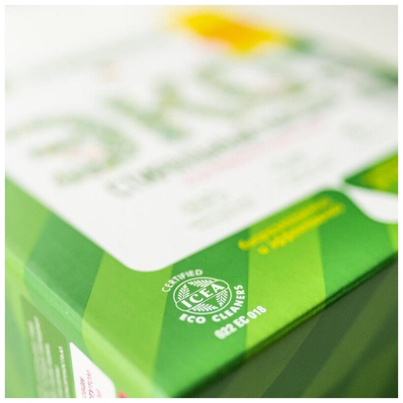 | Химический состав | Цеолит-МАП 15–30%; перкарбонат натрия (кислородный отбеливатель) 15–30%; Н-тензиды (ПАВ из растительного масла) 5–15%; сода кальцинированная 5–15%; силикат натрия 5–15%; пищевая сода 5–15%; А-тензиды (ПАВ из растительного масла) 5–15%; мыло (из растительного масла) < 5%; зелёные хелаты < 5%; антиресорбент < 5%; биоразлагаемый активатор отбеливания < 5%; ингибитор переноса красителей < 5%; растительные энзимы без ГМО < 5%; сульфат натрия < 5%. |