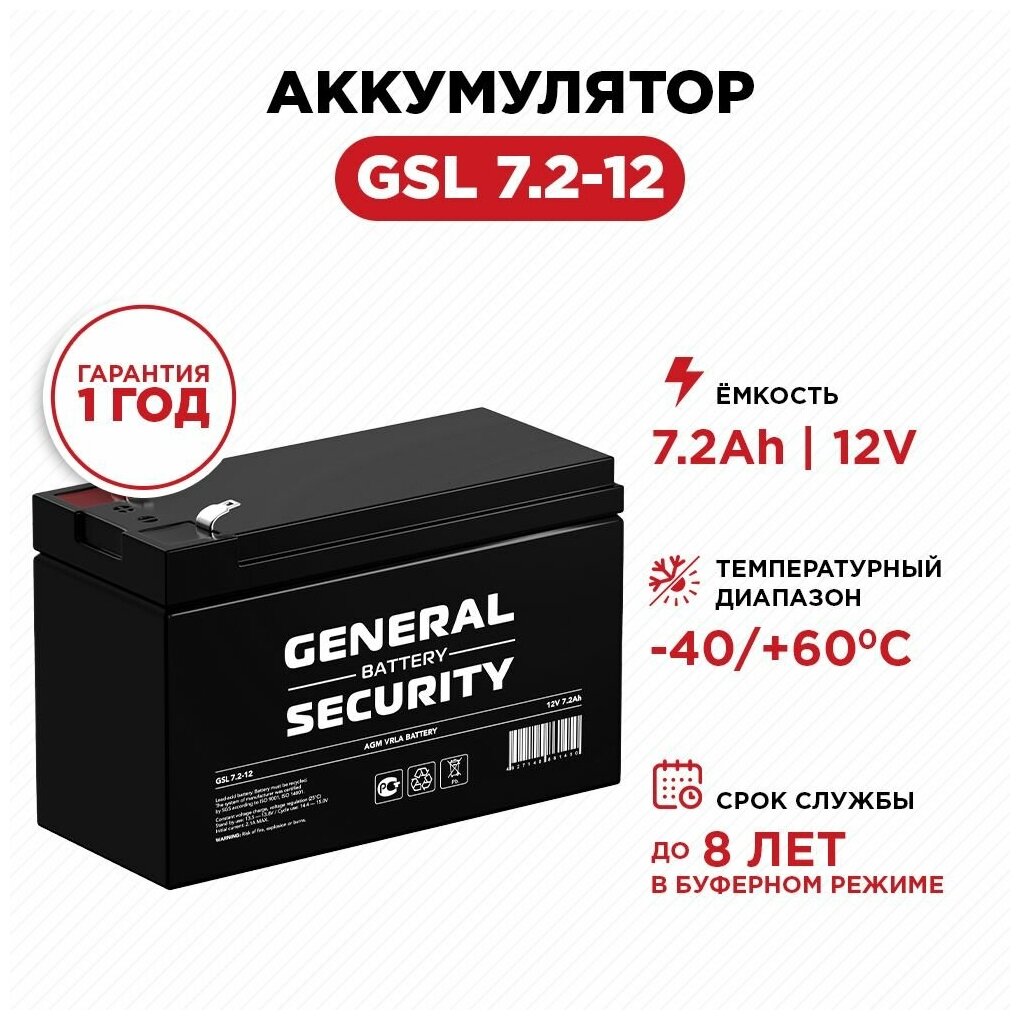 Свинцово-кислотные аккумуляторы General Security серии GSL разработаны для обеспечения резервным питанием систем охраны и безопасности, телекоммуникационного оборудования, промышленных объектов широкого назначения, работы в ИБП. Наилучшее использование батарей обеспечивается в буферном режиме. Достоинства: герметичность, надёжность и безопасность, высокая мощность выходного тока, малое внутреннее сопротивление, хорошая способность к восстановлению после глубокого разряда.