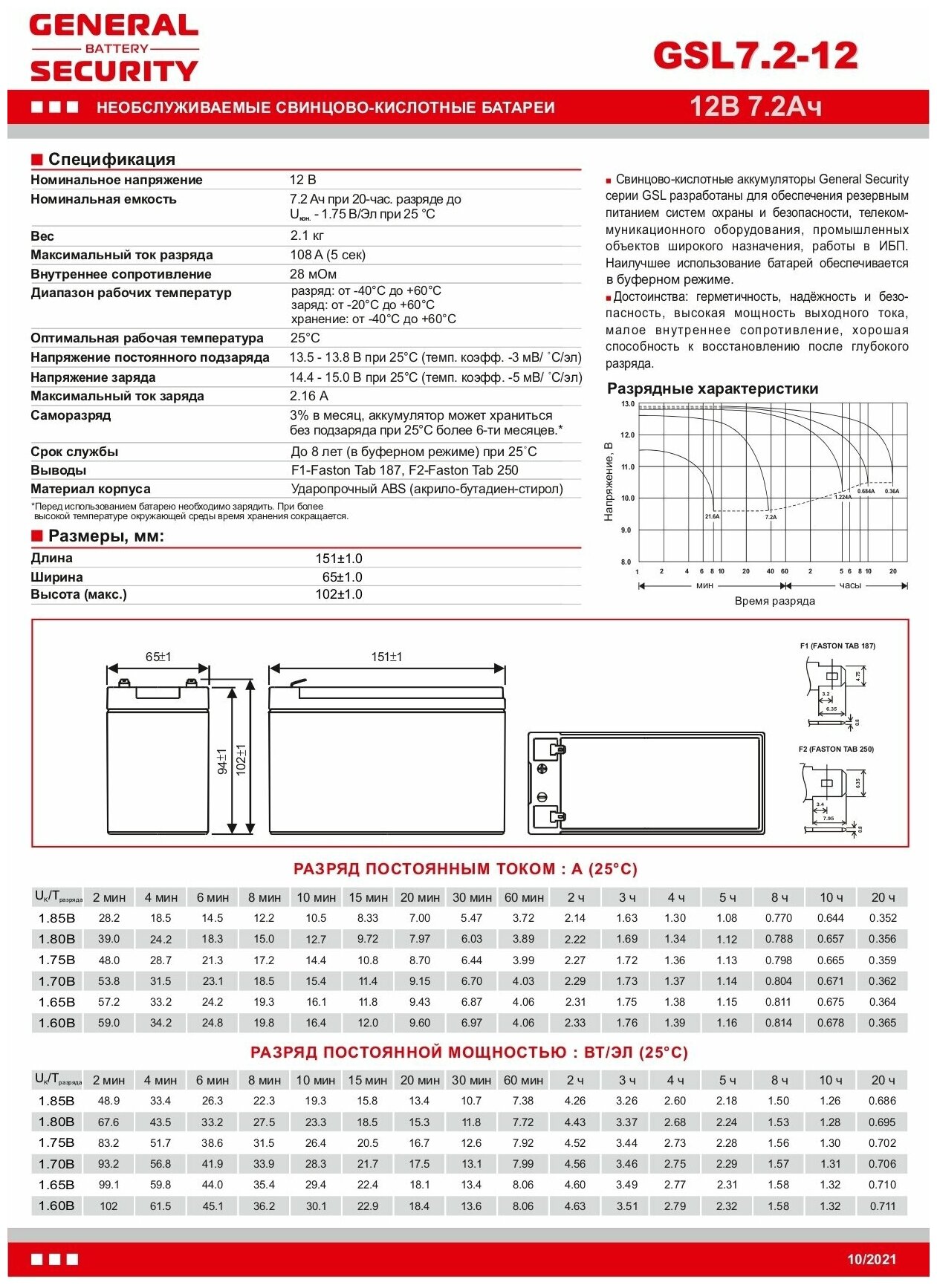 | Стандартная ёмкость при токе 10-часового разряда | 7.2 Ач |