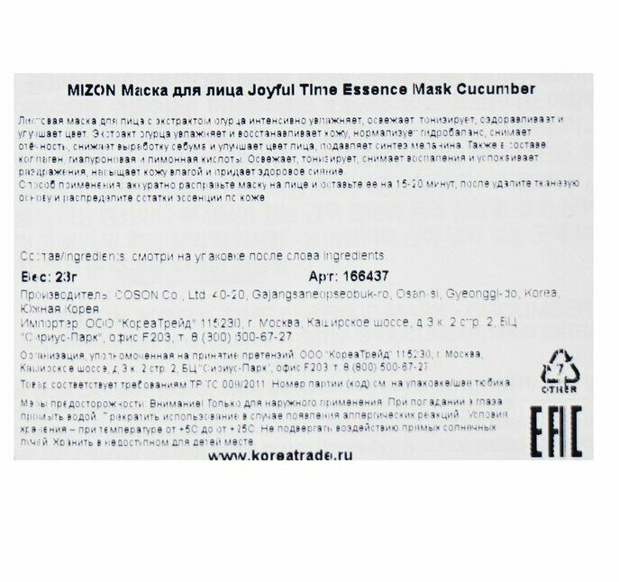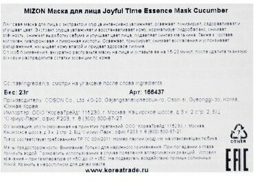 | Коллекция | Mizon Joyful Time Essence Mask Cucumber |