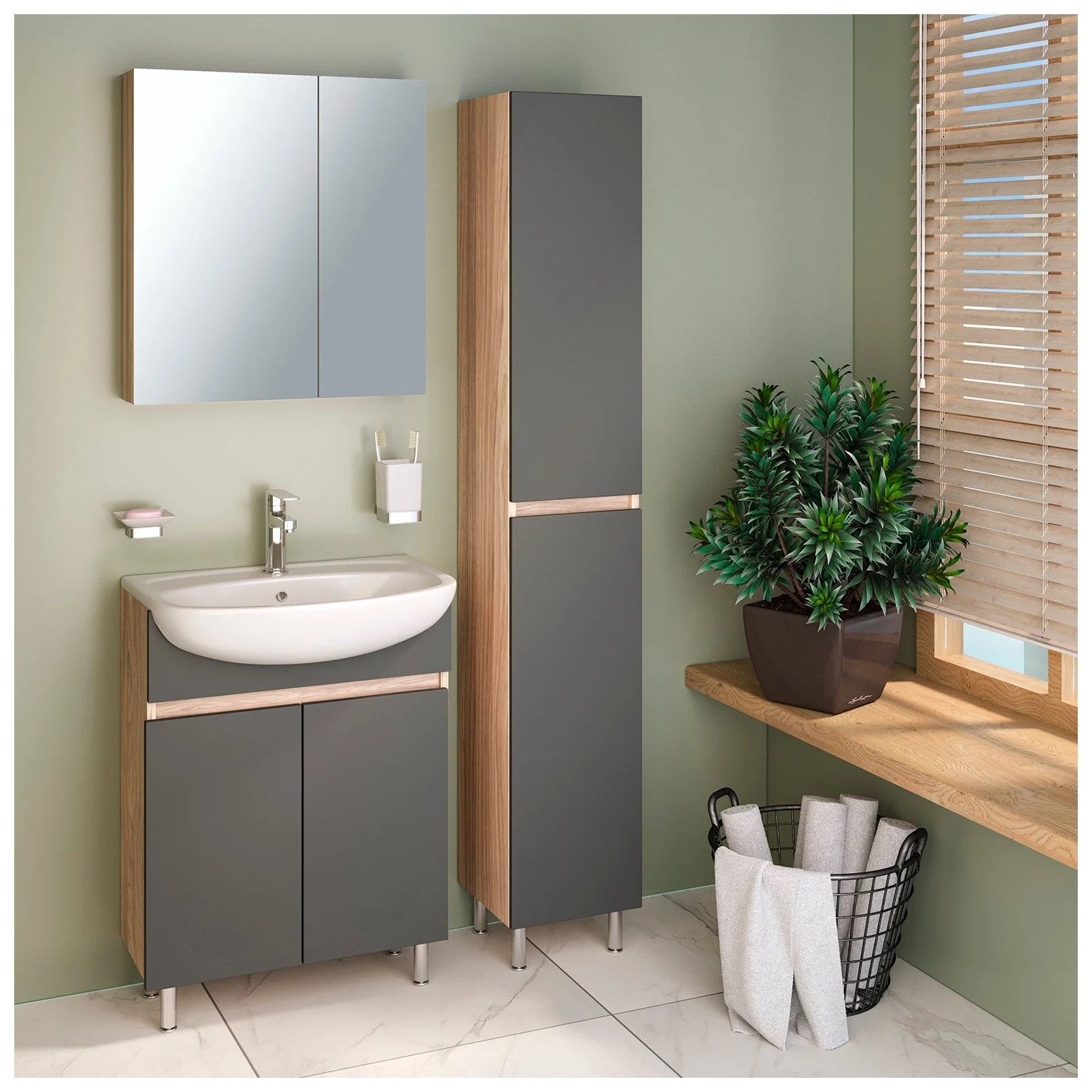 Пенал для ванной Runo Лада 00-00001167. Шкаф пенал для ванной RUNO ЛАДА - модное и оригинальное решение для бюджетного оснащения ванной комнаты. Шкаф для ванной (напольный) выполнен в двух цветах - классическом белом и в стильном цвете - графит/серый дуб, идеально впишется в любой интерьер ванной комнаты. Шкаф в ванную имеет две распашные дверцы, в нижнем и верхнем отделениях по одной встроенной полке. В комплекте идут петли со встроенным доводчиком, 2 хромированные и 2 пластиковые ножки. Мебель для ванной RUNO - красота и практичность в мелочах!