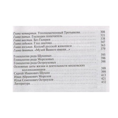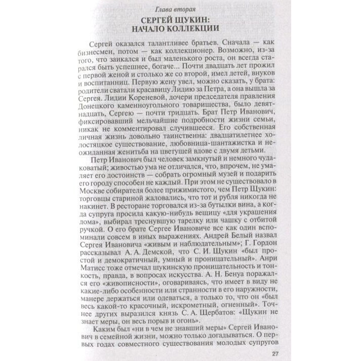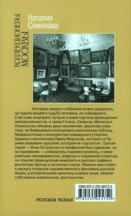 Историю каждого собрания можно разделить на судьбу вещей и судьбу человека, их собравшего. Счастьем лицезреть лучшие в мире картины французских импрессионистов, а также Гогена, Сезанна, Матисса и Пикассо мы обязаны двум москвичам: дерзкому новатору, не боявшемуся эпатировать московскую публику, безжалостному к конкурентам коммерсанту Сергею Щукину и миллионеру Ивану Морозову, которого в Париже называли "русский, который не торгуется". Третий герой - Илья Остроухов по профессии был художник, но по призванию - собиратель и музеестроитель, с невероятным темпераментом, азартом и подлинной страстью он покупал французскую живопись и русскую графику; восточную бронзу и античное стекло. Именно ему ставят в заслугу открытие художественного феномена русской иконы, в которой ранее ценились совсем иные, нежели собственно живописные, достоинства.