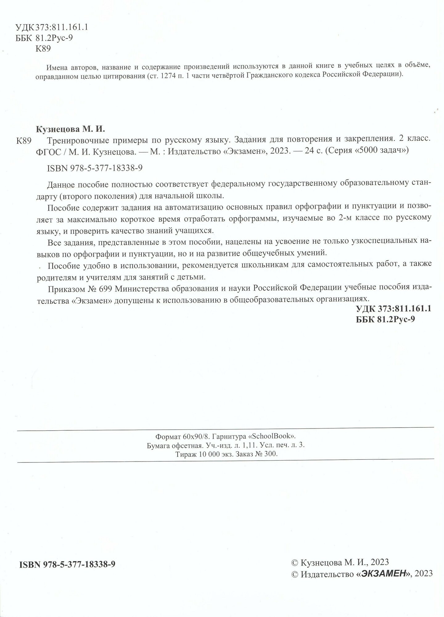 Тренировочные примеры по русскому языку 2 класс Задания для повторения и закрепления (Марта Ивановна Кузнецова); Экзамен, 2023