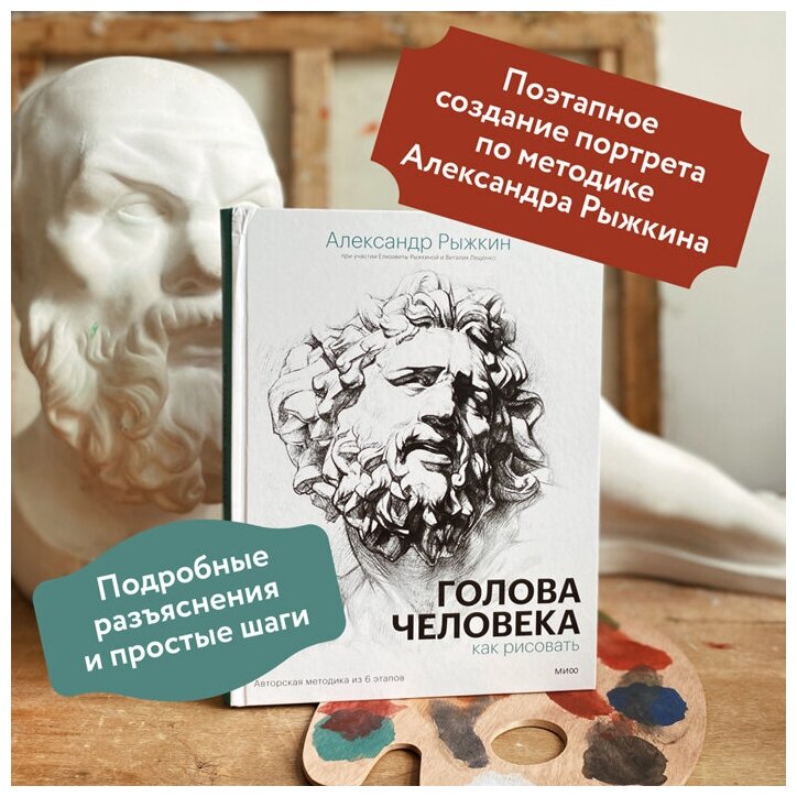Я очень люблю Александра Рыжкина, он действительно потрясающе интересно и доступно объясняет - смотрела много его обучающих видео, невозможно оторваться. Но книга, к сожалению, несколько разочаровала (купила, опираясь на отзывы). Да, в ней рассмотрены примеры и показаны наброски в несколько этапов, но! Сами объяснения построения оставляют желать лучшего, потому что все написано сплошным текстом, если вы не сильно хорошо ориентируетесь в анатомических терминах ( сошник, собачьи ямки, альвеолярные края и т.д.), то довольно трудно сопоставлять описание текстом с картинкой с наброском! То есть даже не с самим черепом, например, а уже с рисунком. Приходится сначала гуглить, как это выглядит на черепе, потом уже смотреть на рисунок и выделять ( я в итоге черкаю прямо в книге, чтобы сопоставить текстовое описание с рисунком), где именно та или иная дуга из описания проходит, что имелось в виду. Мне кажется, было бы очень полезно, если бы все эти важные элементы были выделены на рисунке разноцветными отрезками со сносками в описании (см. тот или иной элемент на рисунке). Либо как приложение, можно вынести туда необходимые схемы с разметками и отмерянными пропорциями, именно этого очень не хватает в тех книгах по академическому рисунку головы, которые я встречала. Мне кажется, там было бы проще начинающим ориентироваться.