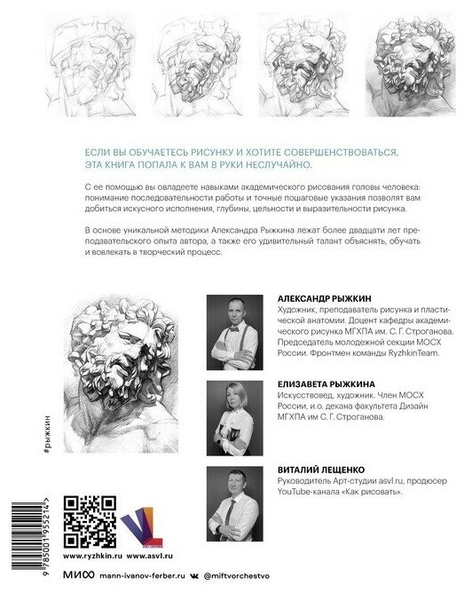 В основе книги лежит методика Александра Рыжкина, основанная на двадцатилетнем опыте преподавания, а также его талант объяснять, обучать и вовлекать в творческий процесс. Книга станет незаменимым пособием для художника, иллюстратора, дизайнера, аниматора и любого, кто всегда хотел рисовать реалистичные портреты.