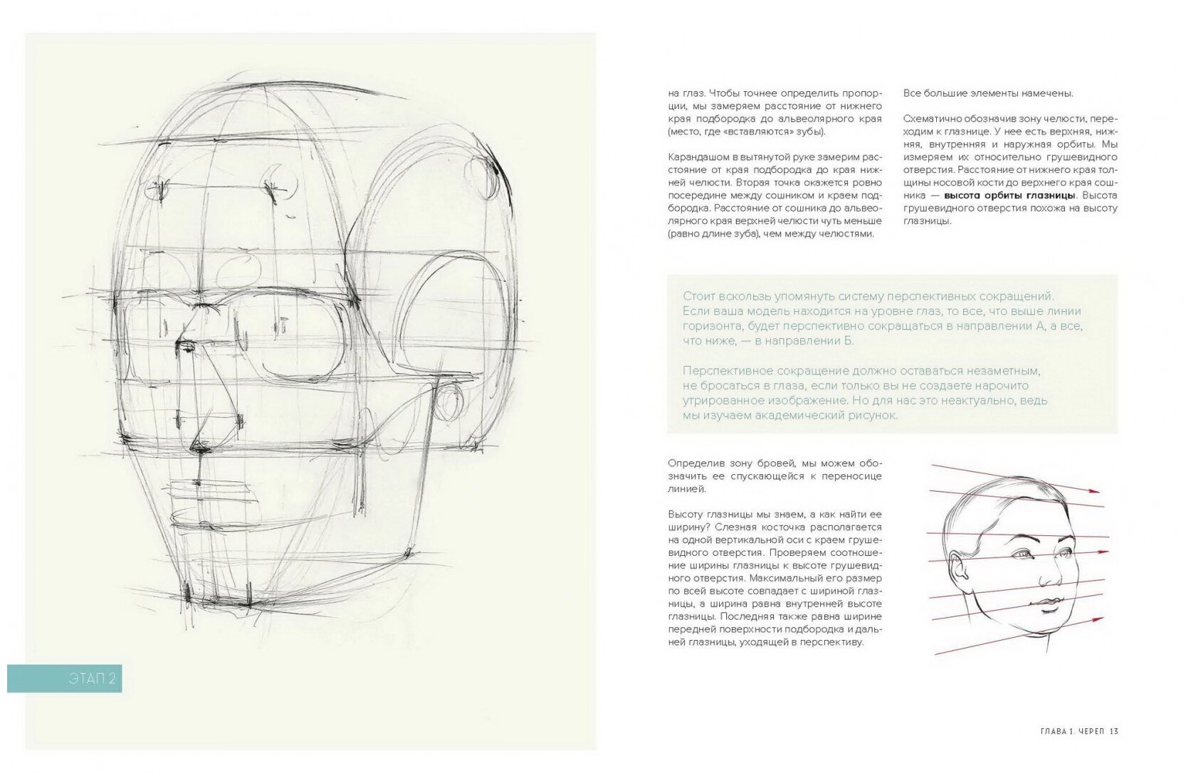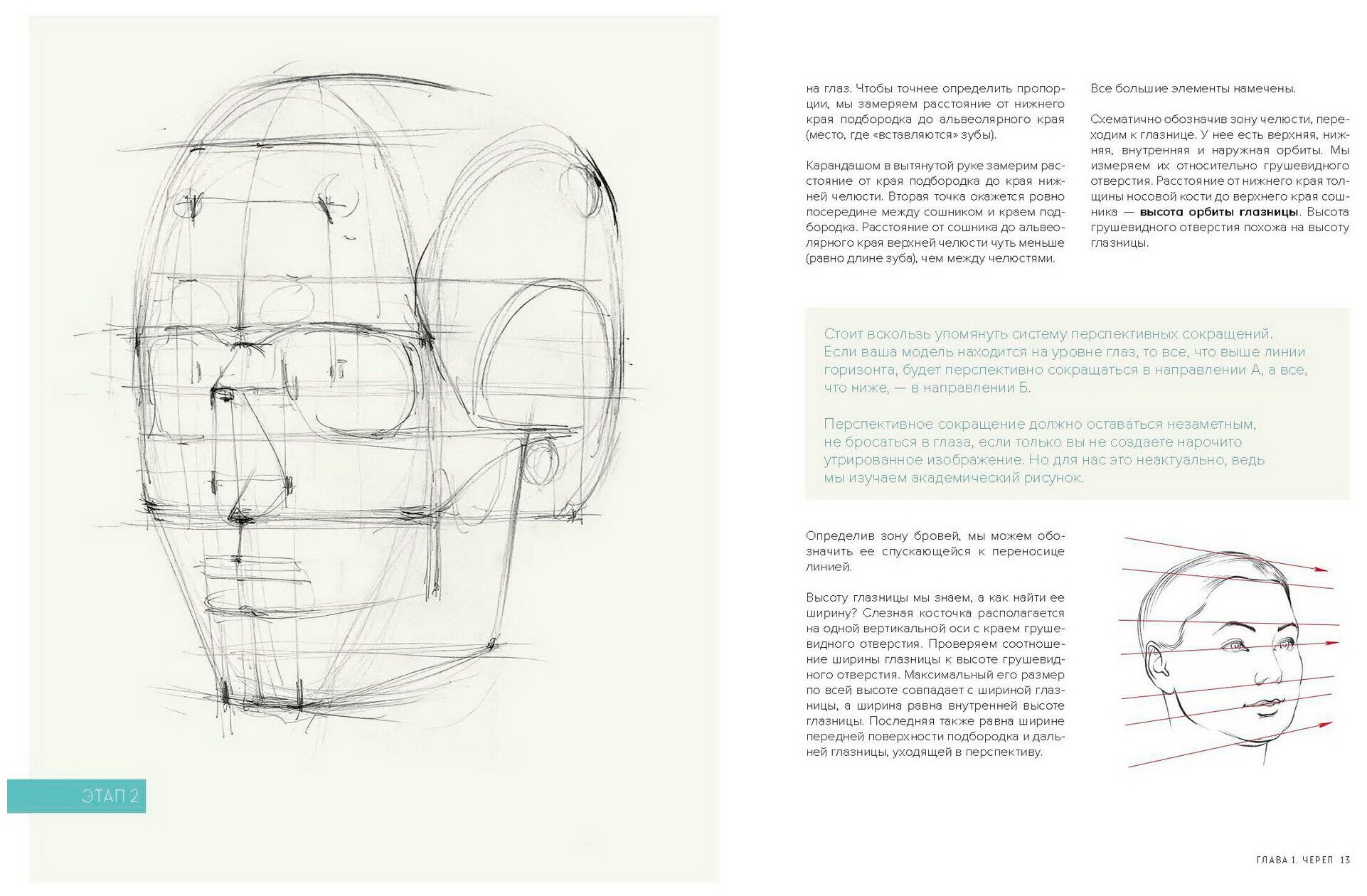 Автор дает пропорции, поясняет, как размещать рисунок на листе, показывает строение, учит штриховке. Конечно, по книге сложно учиться рисовать, но, если изучить ее и применять данные советы на практике, вы скорей всего научитесь не рисовать впадины там, где должны быть выпуклости и наоборот. А изучив строение черепа, сразу будете видеть и понимать, как рисовать портрет, чтобы лицо не выглядело мятым и неестественным.
