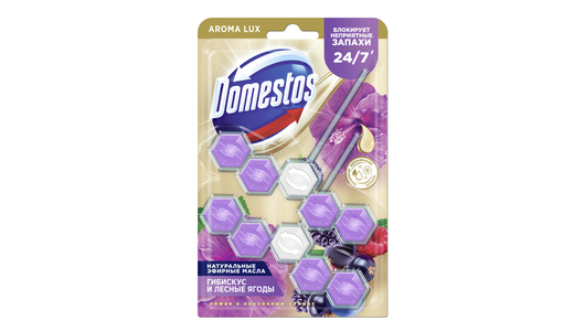 | Способ применения | Вскройте пластиковую упаковку и достаньте блок. Поместите блок под ободок унитаза в место наиболее сильного потока воды с помощью держателя (предварительно разорвав перемычку при ее наличии). По окончании использования блока выбросите его в мусорное ведро и установите новый блок Domestos Aroma Lux. Тщательно вымойте руки. |