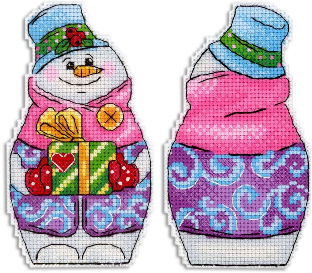 Набор для вышивания ТМ «Жар-Птица» арт. Р-844 "Снеговик с подарками". Состав: канва пластиковая 14 каунта, нитки мулине 18 цветов ПНК им. Кирова, разобранные на органайзере, игла, схема и руководство по вышиванию. Размер: 13*7,5 см.