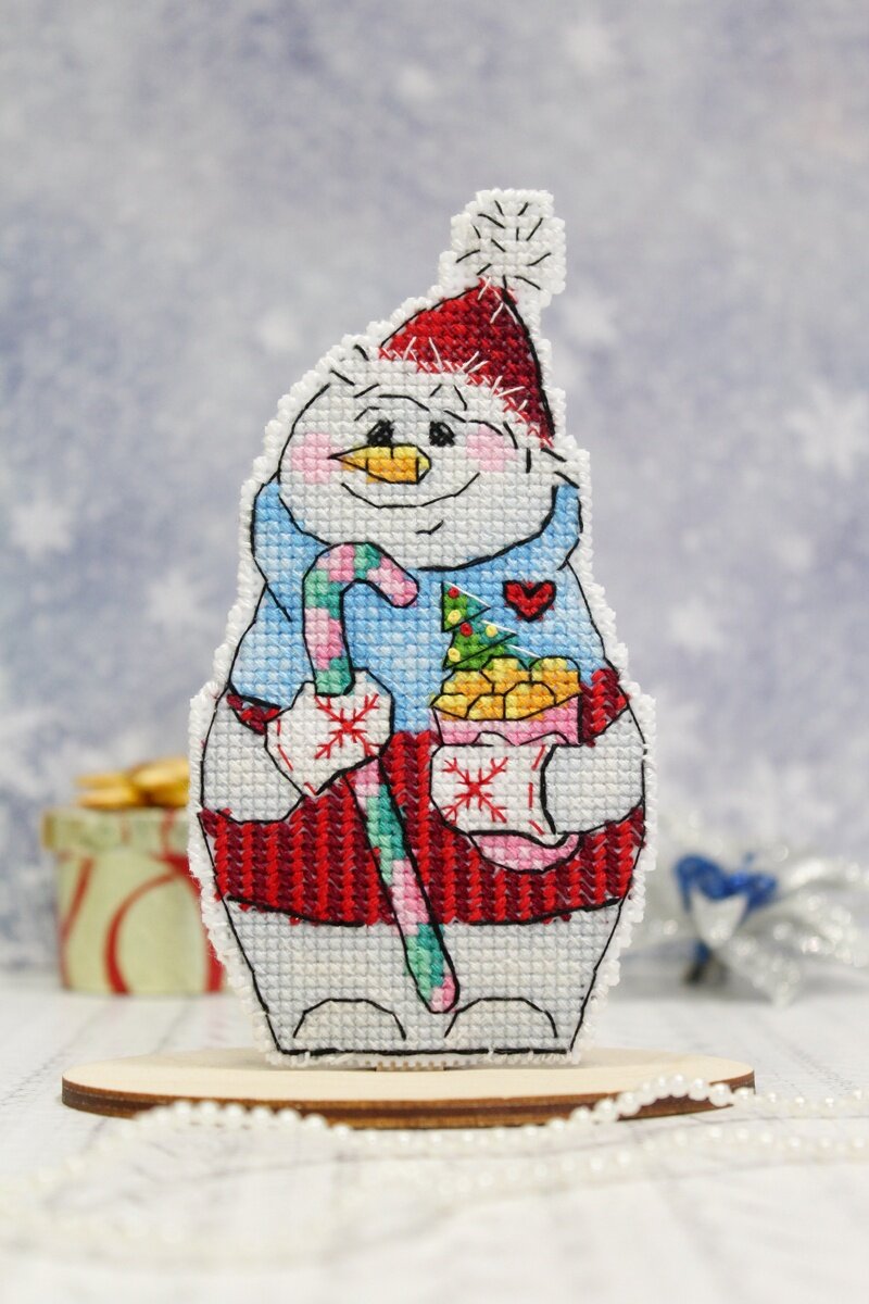 Набор для вышивания ТМ «Жар-Птица» арт. Р-844 "Снеговик с подарками". Состав: канва пластиковая 14 каунта, нитки мулине 15 цветов ПНК им. Кирова, разобранные на органайзере, игла, схема и руководство по вышиванию. Размер: 13*7 см.