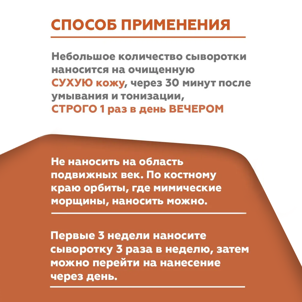 Домашний уход: наносится на очищенную сухую кожу через 15- 20 минут после умывания и тонизации, строго 1 раз в день, вечером. Небольшое количество сыворотки (с горошину на лицо или в два раза больше, если на лицо, шею и декольте) распределить по коже до полного впитывания. В дневное время применять средства с SPF. В случае необходимости применения смягчающих и питательных средств, их нанесение допускается через 30-60 минут после нанесения сыворотки.