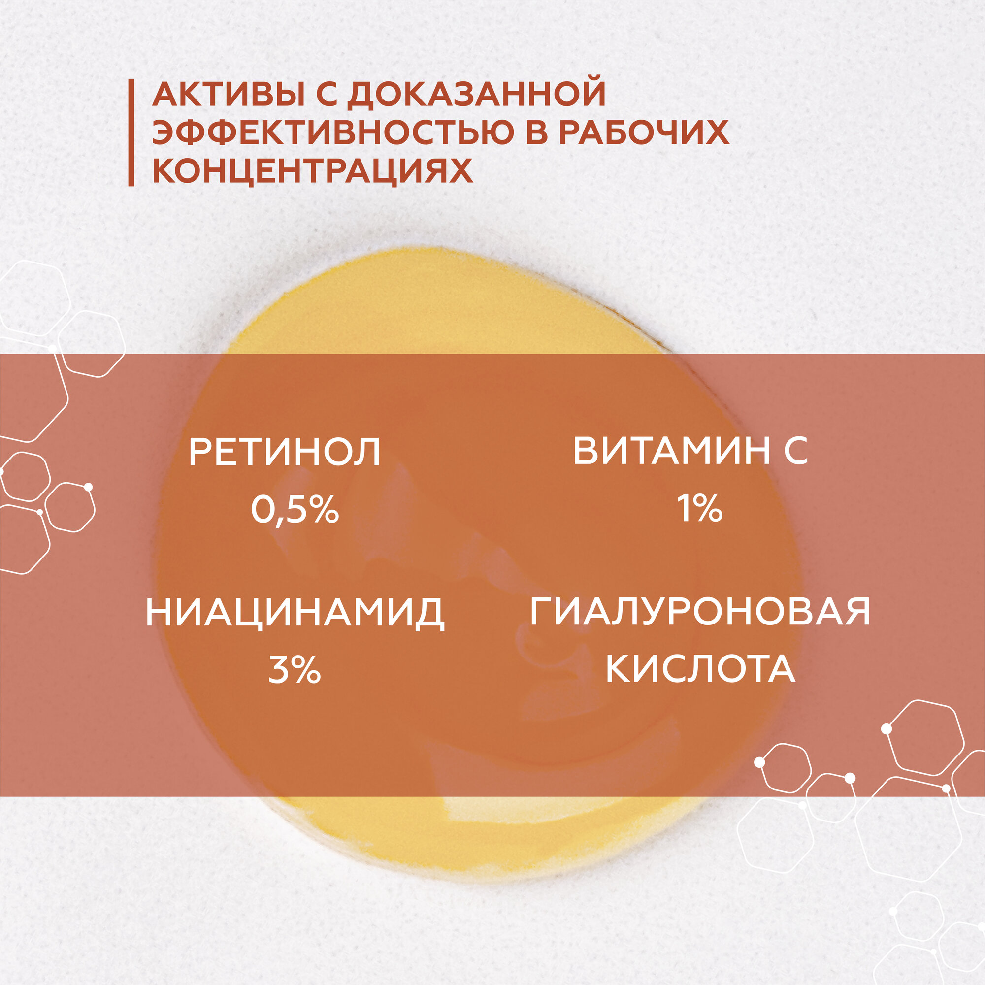 | Активные компоненты | В состав входит ретинол и липосомальный ретинол - в совокупности 0.5%, ниацинамид (3%), витамин С (аскорбил глюкозид, 1%), масло сладкого миндаля, фукогель, высокомолекулярная гиалуроновая кислота, витамин Е |