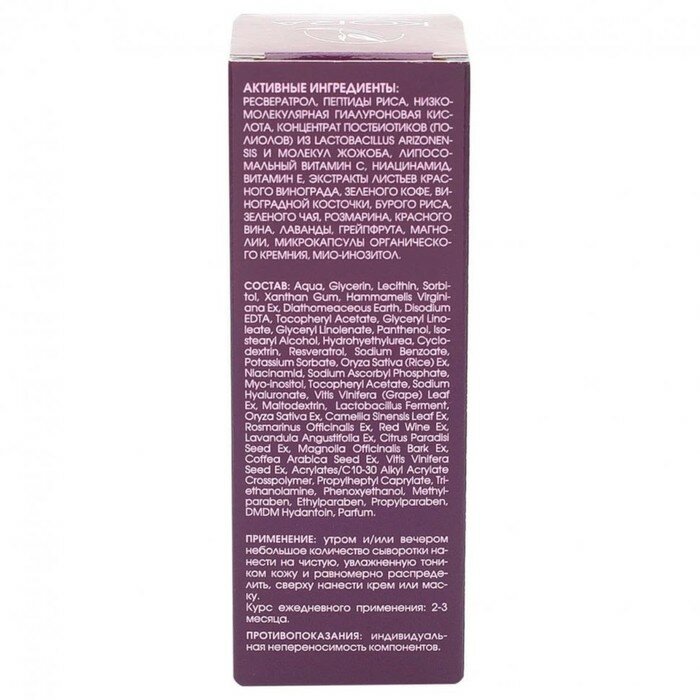 | Активный ингредиент | витамин C, витамин E, гиалуроновая кислота, ниацинамид, пептиды, ресвератрол, Экстракт красного вина |