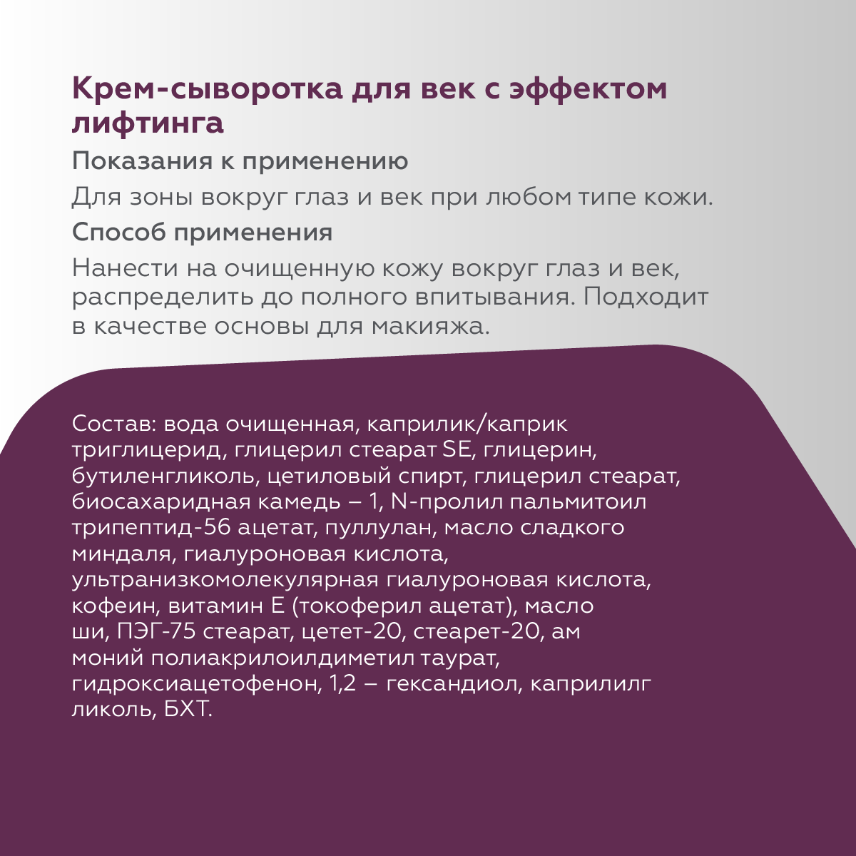| Способ применения | Нанести на очищенную кожу вокруг глаз и век, распределить лёгкими массажными движениями до полного впитывания. При необходимости, поверх крема-сыворотки можно нанести солнцезащитное средство. Подходит в качестве основы для макияжа |