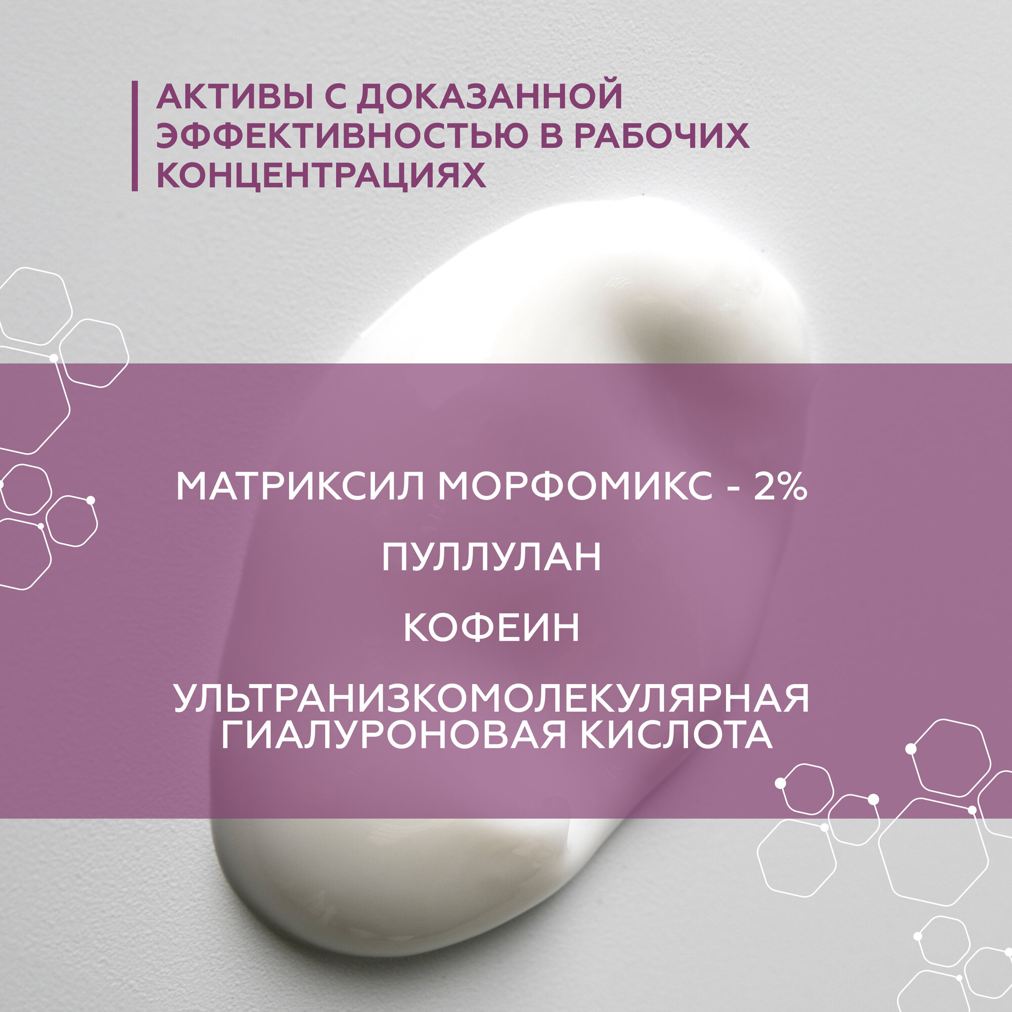 | Состав | вода очищенная, биосахаридная смола-1, цетеарил оливат, сорбитан оливат, дигептил сукцинат и каприлоил глицерин/себациновой кислоты сополимер, глицерил стеарат, глицерин, N-пролил пальмитоил трипептид-56 ацетат (Матриксил Морфомикс), пуллулан, масло сладкого миндаля, гиалуроновая кислота, кофеин, витамин Е, масло Ши, пропилен гликоль, жермабен, аммониум акрилоилдиметилтаурат/VP сополимер, тиногард ТТ, отдушка |